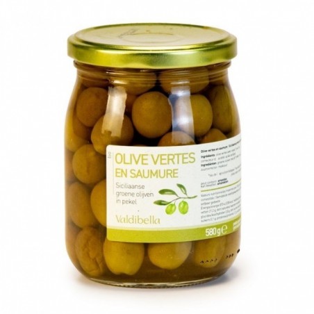 Olives vertes en saumure AVEC noyaux - variété Nocellara Sicile pot verre 330g net égoutté