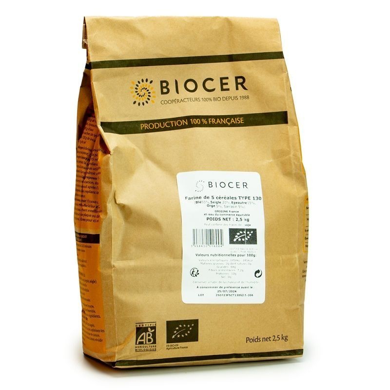 La farine 5 céréales est obtenue par mouture d'un mélange de blé, seigle, épeautre, orge et sarrasin. Elle se démarque par ses arômes rustiques et ses saveurs multiples.