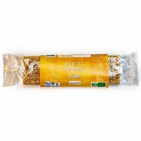Une délicieuse barre de céréales pour faire le plein d'énergie à base de sésame et de miel. Le sésame est issu des filières équitables et en culture biodynamie sur les rives du Nil en Egypte. A croquer à tout moment de la journée, pour une regain d'énergie.