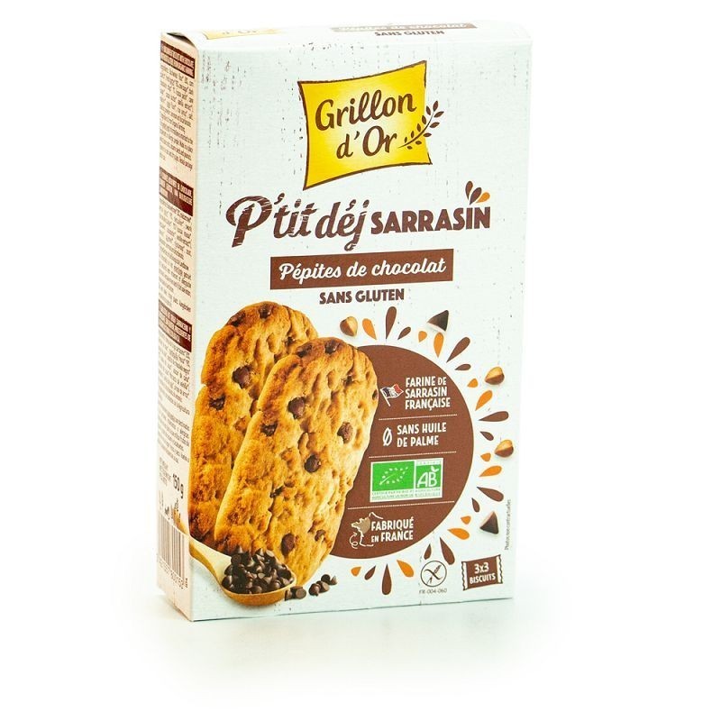 De délicieux biscuits petit-déjeuner à base de farine de sarrasin français, agrémentés de pépites de chocolat noir. Produit certifié sans gluten et garanti sans huile de palme.