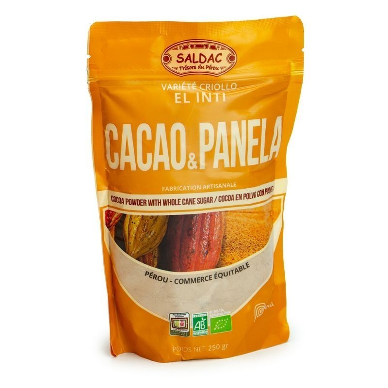 Cacao en poudre sucré avec du sucre de canne complet panela biologique. Transformé au Pérou par une petite chocolaterie avec les fèves Criollo (coopérative Pangoa). La gamme de chocolat de Saldac est certifiée commerce équitable par le système SPP (Symbôle des Producteurs Paysans).