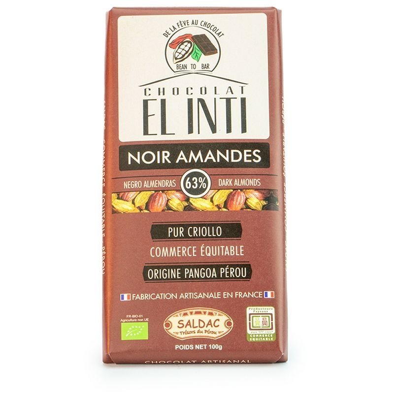 Chocolat noir 63 % de cacao, 15 % d'éclats d'amandes, sucre de canne complet du Pérou (panela), biologiques. Excellent pour le goûter des petits et des plus grands. Très parfumé. Un vrai chocolat artisanal fabriqué à partir de la fève de cacao pur criollo. La gamme de chocolat de Saldac est certifiée commerce équitable par le système SPP (Symbôle des Producteurs Paysans).