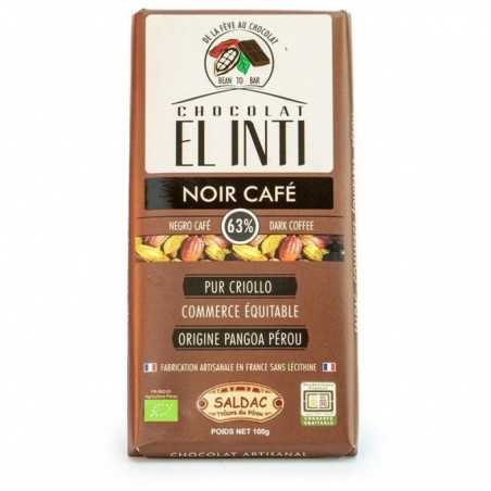 Chocolat noir 63 % de cacao, sucre de canne complet du Pérou, café du Pérou (Palomar) 4 %, biologique. Pour les amateurs de café. Intense et onctueux. A déguster avec un bon café. Un vrai chocolat artisanal fabriqué à partir de la fève de cacao pur criollo. La gamme de chocolat de Saldac est certifiée commerce équitable par le système SPP (Symbôle des Producteurs Paysans).