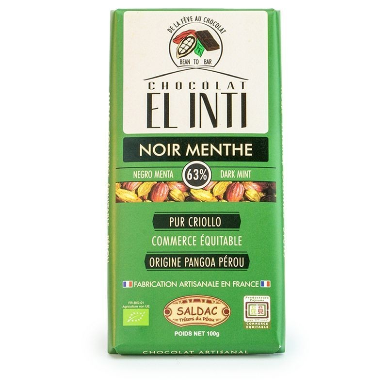 Chocolat noir 63 % de cacao, 2 % de feuilles de menthe poivrée séchées, huile essentielle de menthe poivrée, sucre de canne complet du Pérou (panela), biologique. Excellent mariage la menthe et le chocolat. Puissant et aromatique. Un vrai chocolat artisanal fabriqué à partir de la fève de cacao pur criollo. La gamme de chocolat de Saldac est certifiée commerce équitable par le système SPP (Symbôle des Producteurs Paysans).