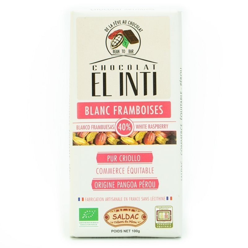 Chocolat blanc 40 % de cacao aux framboises 7%, beurre de cacao réalisé avec les fèves de la Coop. Pangoa Pérou, sucre de canne complet du Pérou (panela), lait entier, framboises lyophilisées, biologique. Un grand cru blanc, un peu beige par la couleur du sucre de canne complet, excellente combinaison avec le fruité et l'acidité des framboises, aromatique à souhait, avec une touche de vanille pour relevé le tout ! La gamme de chocolat de Saldac est certifiée commerce équitable par le système SPP (Symbôle des Producteurs Paysans).