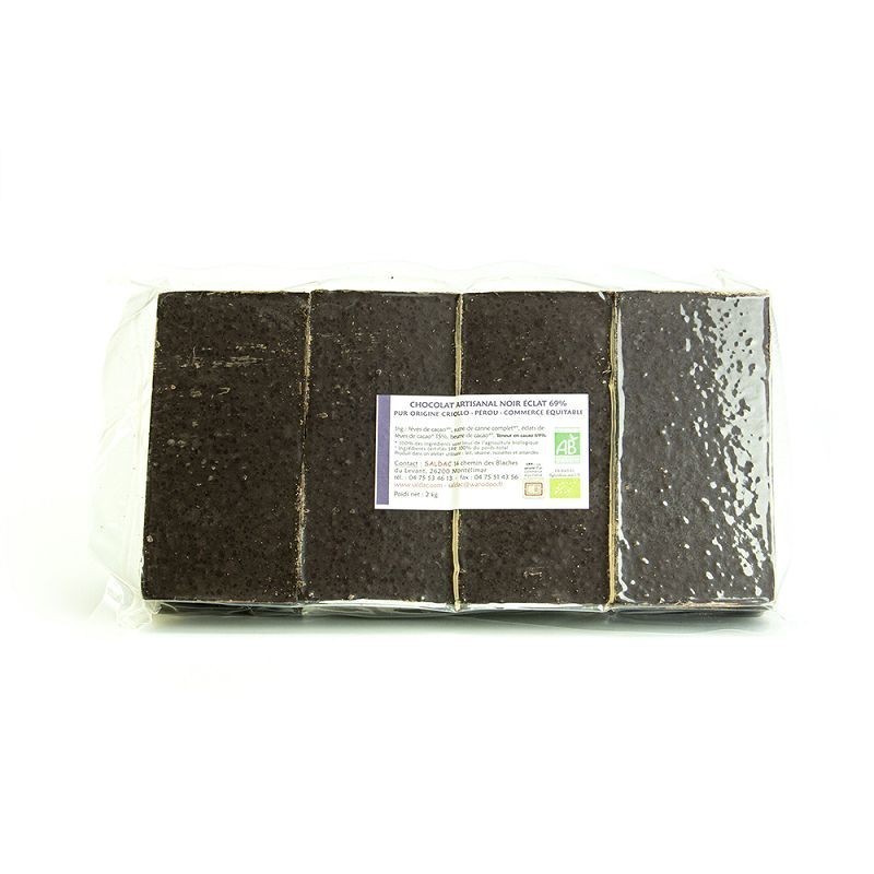 Fractions de tablettes non emabllées de chocolat noir 63 % de cacao et 15 % d'éclats de fèves grillées, fèves de la Coop. Pangoa Pérou, sucre de canne complet du Pérou, biologiques. Pour les connaisseurs de chocolats Grand Cru. Pure origine Criollo, très fruité et croustillant. Un vrai chocolat artisanal fabriqué à partir de la fève. La gamme de chocolat de Saldac est certifiée commerce équitable par le système SPP (Symbôle des Producteurs Paysans).