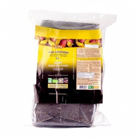 Fractions de tablettes non emballées de chocolat noir 63 % de cacao, 15 % de gingembre confit, gingembre en poudre, sucre de canne complet du Pérou biologique (panela). Excellent mariage entre le gingembre et le chocolat, pour les amateurs de sensations fortes. Un vrai chocolat artisanal fabriqué à partir de la fève de cacao pur criollo. La gamme de chocolat de Saldac est certifiée commerce équitable par le système SPP (Symbôle des Producteurs Paysans).