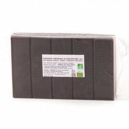 3 grosses tablettes de 1 kg de chocolat noir de couverture 63 % de cacao, biologique, sucre de canne complet du Pérou. Idéal pour la pâtisserie, la fabrication de chocolats pour les fêtes. Divisée en cinq grosses barres faciles à couper. Un vrai chocolat artisanal fabriqué à partir de la fève de cacao pur criollo. La gamme de chocolat de Saldac est certifiée commerce équitable par le système SPP (Symbôle des Producteurs Paysans).