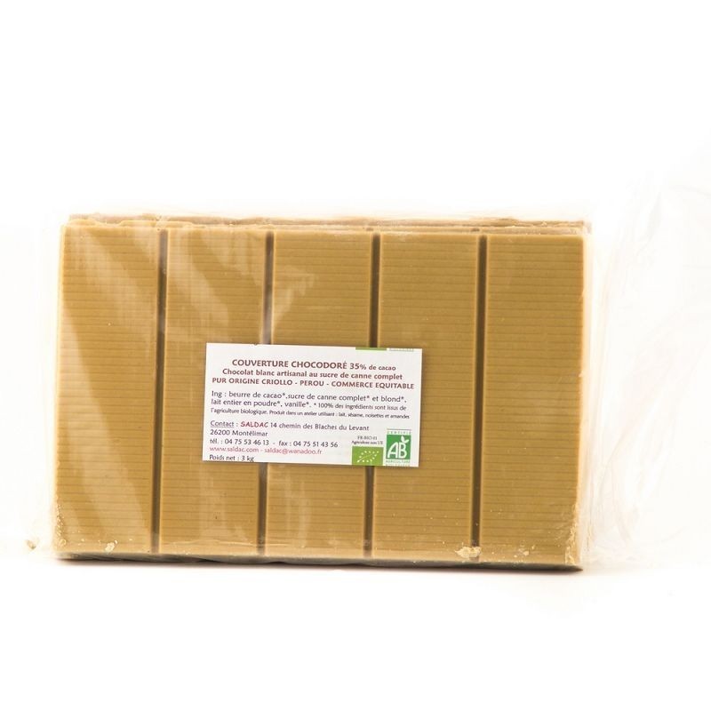 3 grosses tablettes de 1 kg de chocolat blanc de couverture 40 % de cacao, biologique, sucre de canne complet du Pérou. Le beurre de cacao est réalisé avec les fèves de la Coop. Pangoa Pérou, lait entier. Un grand cru blanc, un peu beige par la couleur du sucre de canne complet, excellent, très parfumé, avec une touche de vanille pour relever le tout ! Idéal pour la pâtisserie, la fabrication de chocolats pour les fêtes. Divisée en cinq grosses barres faciles à couper. La gamme de chocolat de Saldac est certifiée commerce équitable par le système SPP (Symbôle des Producteurs Paysans).