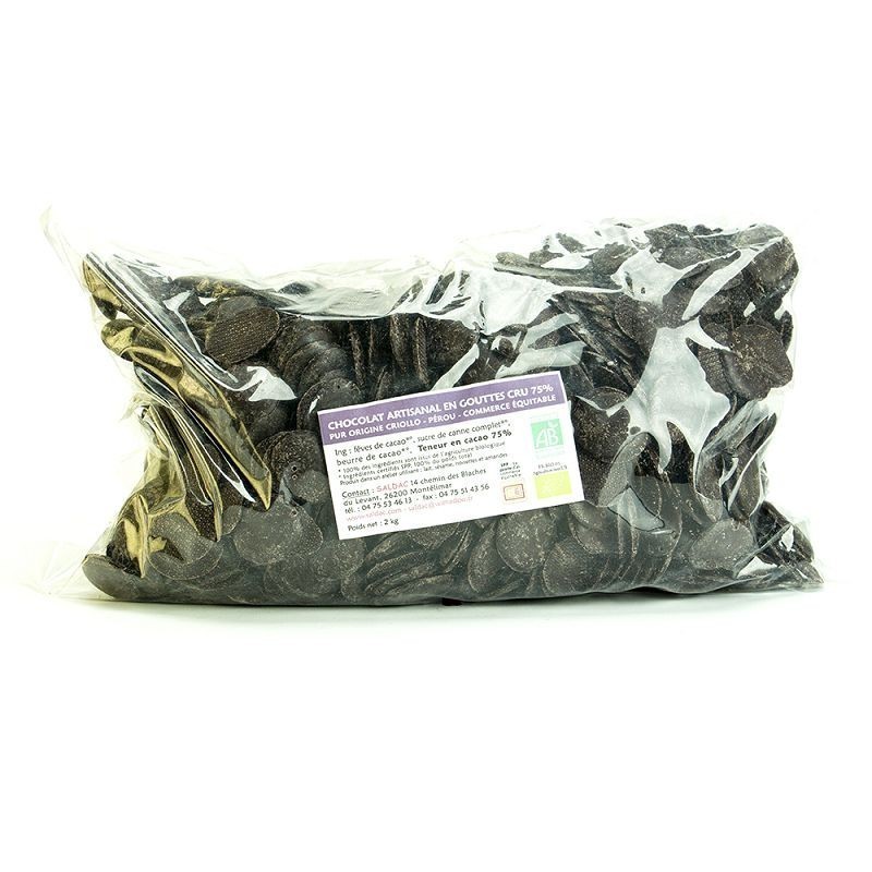 Sac de 2 kg de chocolat Cru noir 75 % de cacao, sous forme de pistoles d'environ 5 g, fèves de la Coop. Pangoa Pérou, sucre de canne complet du Pérou (panela), biologique. Ce chocolat Cru est torréfié à moins de 45 °C, il conserve donc encore mieux ses vitamines et minéraux (magnésium, fer). Pure origine Criollo, très parfumé, se rapproche du goût de la fève, notes florales, d'agrumes et de cerises. Facile à doser. La gamme de chocolat de Saldac est certifiée commerce équitable par le système SPP (Symbôle des Producteurs Paysans).
