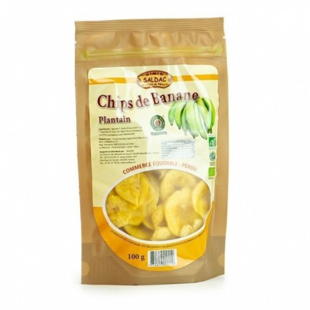Sachet de 100g de chips de bananes plantains vertes biologiques, salées, excellent pour l'apéritif, ou à grignoter à toute heure de la journée. Croquantes et savoureuses. Très bien aussi pour accompagner du poisson. Les bananes séchées de Saldac sont certifiées commerce équitable par le système WFTO (World Fair Trade Organisation).