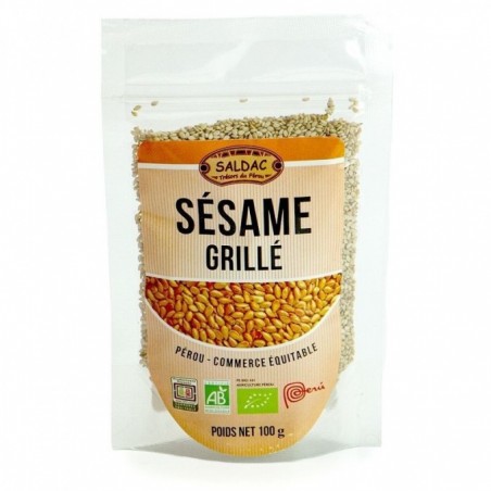 Sachet de 100g de sésame grillé, biologique, idéal pour mettre sur les salades ou à utiliser en cuisine sous différentes formes.