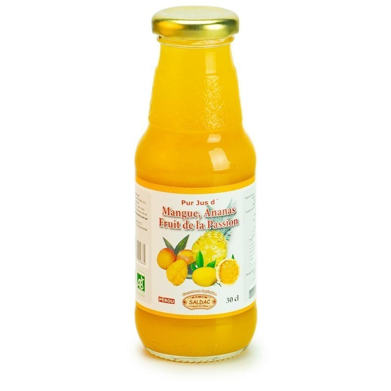 Un pur jus exotique avec 3 fruits, sans eau ni sucre : mangue, fruits de la passion, ananas. Elaboré par l'entreprise familiale Chanchamayo Highland Coffee, qui produit aussi les confitures exotiques pour SALDAC. Les fruits sont issus de différentes petites organisations de producteurs locaux. Tout simplement délicieux !! Un bon goût de mangue avec une légère acidité du fruit de la passion, qui s'équilibre grâce à la douceur de l'ananas. La gamme de jus de fruits Saldac est certifiée commerce équitable par WFTO (World Fair Trade Organization).