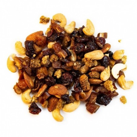 Composition : dattes Deglet Nour**; cranberries*, amandes toastées**, noix de cajou toastées**, mulberries**. *issus de l'agriculture biologique. **issus de l'agriculture biologique & commerce équitable