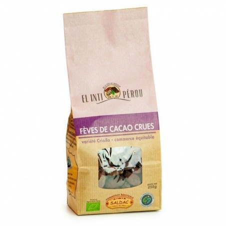 Fèves de cacao crues biologiques, variété Criollo, riche en magnésium. A grignoter simplement, où à faire griller et écraser avec du sucre pour fabriquer son chocolat artisanal. La gamme de chocolat de Saldac est certifiée commerce équitable par le système SPP (Symbôle des Producteurs Paysans).