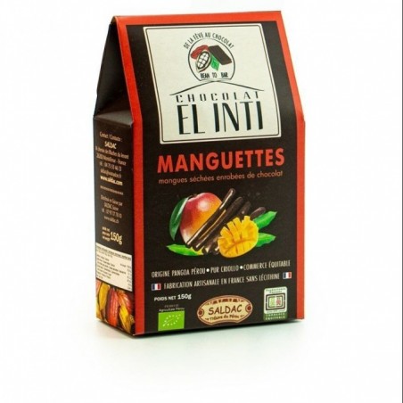 De la mangue séchée au nord du Pérou par nos partenaires, bien parfumée, enrobée de chocolat noir 63 %. Mariage délicat de la mangue et du chocolat. Grand cru de pure origine Criollo, issu de la coop. Pangoa au Pérou, et d'une élaboration artisanale dans la Drôme qui lui révèle tout sa saveur. Sucre de canne complet du Pérou. Biologique. Sans lécithine. La gamme de chocolat de Saldac est certifiée commerce équitable par le système SPP (Symbôle des Producteurs Paysans).