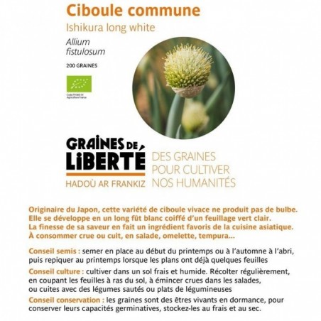 Originaire du Japon, cette variété de ciboule vivace ne produit pas de bulbe. Elle se développe en un long fût blanc coiffé d'un feuillage vert clair.