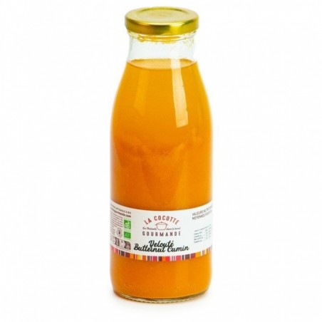 Ingrédients : butternut (45 %), eau, oignon, huile d'olive, sel, cumin (0,2%). Les soupes et veloutés de Cocotte Gourmande sont préparées de manière tout à fait artisanale, Fabien recherche une forte qualité nutritive et ce sont donc des soupes épaisses, charge à chacun d'ajouter la quantité d'eau souhaitée pour obtenir la texture appréciée.